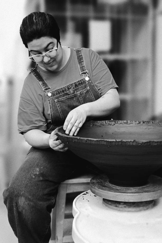 Soy una artista cerámica y textil neurodivergente argentina radicada en Barcelona. Investigadora en el campo de las Ciencias de la Computación y desarrolladora de software, buscaba escapar de un mundo que me presionaba para producir más, más rápido y mejor mientras descuidaba mi salud física y mental. Descubrí la cerámica y rápidamente se convirtió en mi maestra y mi refugio. En cuanto a mi relación con el textil, no recuerdo exactamente cuándo comenzó: me acompaña desde que tengo memoria. Mi abuela y mi madre me enseñaron a tejer. Aunque quise distanciarme de ellas, sus enseñanzas nunca me abandonaron, ni yo las abandoné a ellas.